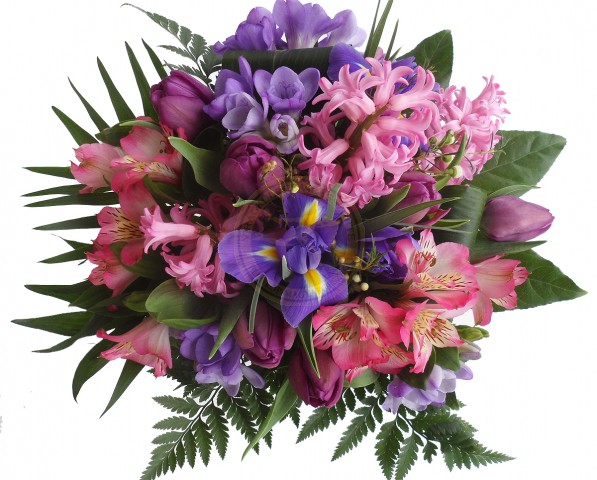 Pink rózsa, gerbera, lilás asztromelia, írisz.